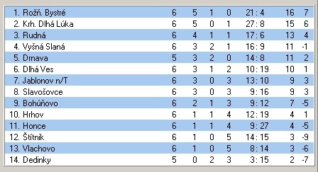 Výsledky 6. kola I. triedy: Rožňavské Bystré – Hrhov 3:1, Vlachovo – Jablonov n/T 2:3, Rudná – Slavošovce 3:0, Krh. Dlhá Lúka – Honce 9:0, Dedinky – Bohúňovo 1:1, Vyšná Slaná – Dlhá Ves 6:1, Štítnik – Drnava 3:4.
