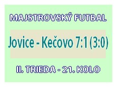 Jovice - Kečovo 7:1 (3:0). Góly: Ruzsnyák 2, Doboš 2, Lindák, Spišák, Lovaš – Garaj. Rozhodoval: Iglai, delegát zápasu: L. Székely. V predposlednom súťažnom zápase tohto ročníka II. triedy privítalo mužstvo Jovíc súpera z Kečova. Počasie veľmi neprialo futbalu, ale to domácich neodradilo. Od začiatku zápasu diktovali tempo zápasu domáci futbalisti, ale ich šance ostali nepremenené. Zlom nastal až v druhej polovici prvého polčasu, keď sa presadil Rusznyák. Hostia takisto pohrozili, no presadiť sa nedokázali. Do prestávky sa za domácich nakoniec presadili Lovaš a Doboš a to ešte Ruzsnyák nepremenil penaltu. V závere polčasu si za vzájomnú potýčku vyslúžili červenú kartu Tomi s