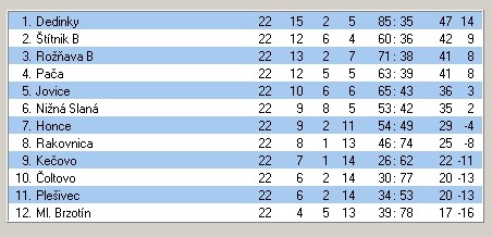 Výsledky II. triedy 22 kolo: Rožňava B – Jovice 0:2, Kečovo – Štítnik B 1:4, Plešivec – Nižná Slaná 1:1, Rakovnica – Pača 1:0, Dedinky – Ml. Brzotín 8:2.