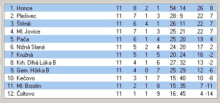 Výsledky 13. kola: Kečovo – Kružná 2:1, Štítnik – Pača 5:1, Ml. Brzotín – Plešivec 0:2, Krh. Dlhá Lúka B – Honce 2:5, Čoltovo – Nižná Slaná 1:1. Jovice a Gem. Hôrka B mali voľno.