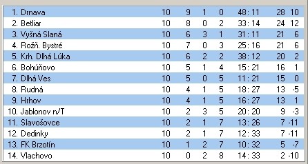 Desiate kolo I. triedy vo futbale na hornom Gemeri prinieslo pár zaujímavbých výsledkov. Ani toto kolo sa v tejto súťaži nezaobišlo bez menších nedostatkov. Najväčším bolo iba sedemčlenné družstvo FK Brzotín, ktoré prišlo do Krásnohorskej Dlhej Lúky a už po 15 minutách za stavu 3:0 pre domácich zápas rozhodca ukončil pre nízky stav hráčov hostí - 6. Tomuto odielu sa to už raz v tohtoročnej súťaži stalo. Brzotín, aj keď má dve futbalové družstvá, neukazuje ako sa má k majstrovským zápasom pristupovať. Ale to je vec na iných, aby o tom pouvažovali. Rožňavské Bystré v tomto kole utrpelo na domácom ihrisku prvú tohtoročníkovú tesnú prehru s ambicióznym súperom z Betliara a pomohlo