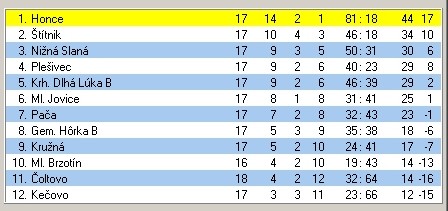 PRIEBEŽNÁ TABUĽKA II. TRIEDY PO NEÚPLNOM 21. KOLE: