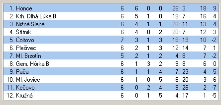 zápas – v jesennej časti – v Kružnej. Zbytočnými stratami bodov zapríčinenými kontumáciami sa o postupujúce miesto pripravil Štítnik a prakticku do konca súťaže už o nič iné nepôjde, len o boj o ďalšie miesta. Statočne o druhé miesto v tabuľke bojuje Nižná Slaná, ktorá s najslabším mužstvom súťaže – Kečovom iba remízovala.
