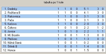 Ostatné zápasy II. riedy 1. kola: Dedinky - Honce 5:1, Rožňava B - Štítnik B 4:1, Kečovo - N. Slaná 2:0, Rakovnica - Ml. Brzotín 3:1, Plešivec - Pača 1:3.