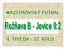 SP MFK Rožňava "B" - TJ ML. Jovice 0:2 ( 0:1). G: J. Ruzsnyák, A. Lovaš, R: J. Gyenes, DZ: Heveši. Zostava Jovíc: Sopócy - Doboš, Szabó, Nagy (C), Klárik, Tomi ml., Lovaš, "Paťo", Ruzsnyák, Lindák, Spišák. V poslednom kole končiaceho ročníka futbalovej II. triedy vycestovali hráči Jovíc do neďalekej Nadabuly, kde hráva svoje zápasy rožňavská rezerva. Hráči domácich až na jednu výnimku nemali k dispozícii hráčov A - mužstva, ktoré popoludní hrá s družstvom Medzeva. Už zo začiatku bolo jasné, kto bude hrať "prvé husle" v tomto zápase. Hostia mali mnoho príležitostí na skórovanie, no nedarilo sa im. Veľmi dobrým výkonom sa prezentoval brankár domácich, ktorý mnoho šancí