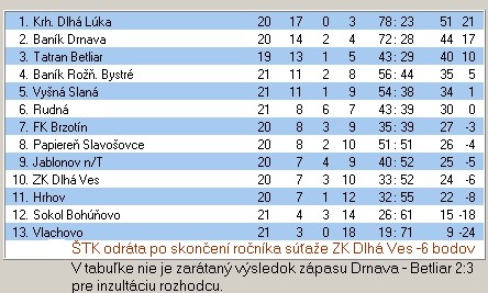 z Jablonova n/Turňou, čo iste povzbudí domácich k lepším výkonom. Prekvapila však najmä vysoká prehra Vyšnoslancov v Slavošovciach, ktorí doteraz podávali slušné výkony. Dlhovešťania po výprasku v minulom kole zabrali na ihrisku v Kunovej Teplici, kde si ľahko poradili s Hrhovčanmi vysoko 7:1. Pohľad na tabuľku hovorí o tom, ako zvádzajú súboj dve mužstvá - Krásnohorská Dlhá Lúka a Vlachovo najmä v tom, ktoré prvé z nich dosiahne stovku gólov. Kým prvé mužstvo to bude zrejme tešiť, to druhé bude mať ešte väčšiu hlavu v smútku. Ale to športe to už tak býva. A vo futbale zvlášť.