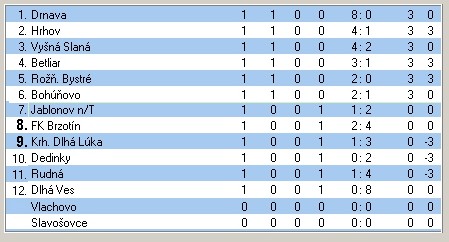 Výsledky: Dedinky - Rožňavské Bystré 0:2, Drnava - Dlhá Ves 8:0, Krásnohorská Dlhá Lúka - Betliar 1:3, Rudná - Hrhov 1:4, Bohúňovo - Jablonov n/T 2:1, Vyšná Slaná - FK Brzotín 4:2.