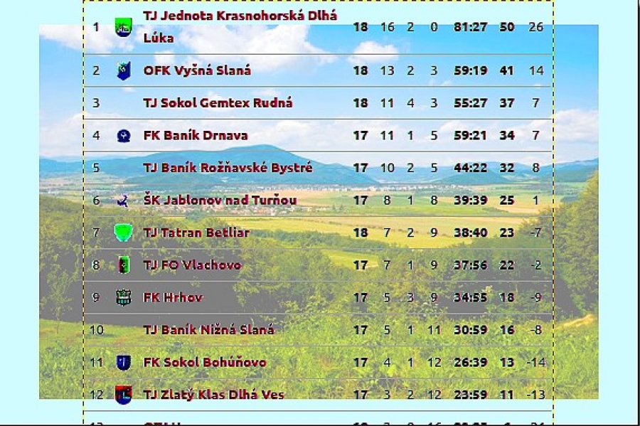 Neprehrali ani teraz vo Vyšnej Slanej, ktorej hráči v jeseni dokázali s nimi doma remizovať. V 19. kole si priviezli spod Radzimu tri body, ktoré získali už hrou v 1. polčase. Najväčšie prekvapenie sa však zrodilo v Rudnej, kde hráči z Rožňavského Bystrého obrali domácich o tri body a zaznamenali im už druhú prehru na domácej pôde. Najviac gólov počas tohto víkendu padlo v Rožňave a v Krásnohorskom Podhradí, kde na dorasteneckých zápasoch videli diváci spŕšku gólov - v Rožňave 16 a v Podhradí 15! Najviac nimi potešili seba i domácich fanúšikov. Z mužstiev z vyšších súťaží sú na tom najlepšie futbalisti A mužstva Krásnohorského Podhradia, ktorí stále vedú tabuľku V. ligy. Držme im aj naďalej palce v boji o tohtoročného víťaza.