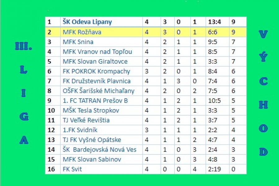 MFK Rožňava - MFK Slovan Sabinov 2:1 (2:0), G: P. Štyvar 2 – M. Strelec, ŽK: P. Sappanoš, M. Gallo – M. Tomaško, D. Lukáč, M. Vranko, P. Kolpál, M. Kiseľa, R. Lapoš. R: D. Alexa – S. Vass, B. Marko, DS: J. Kmec, Div.: 150.