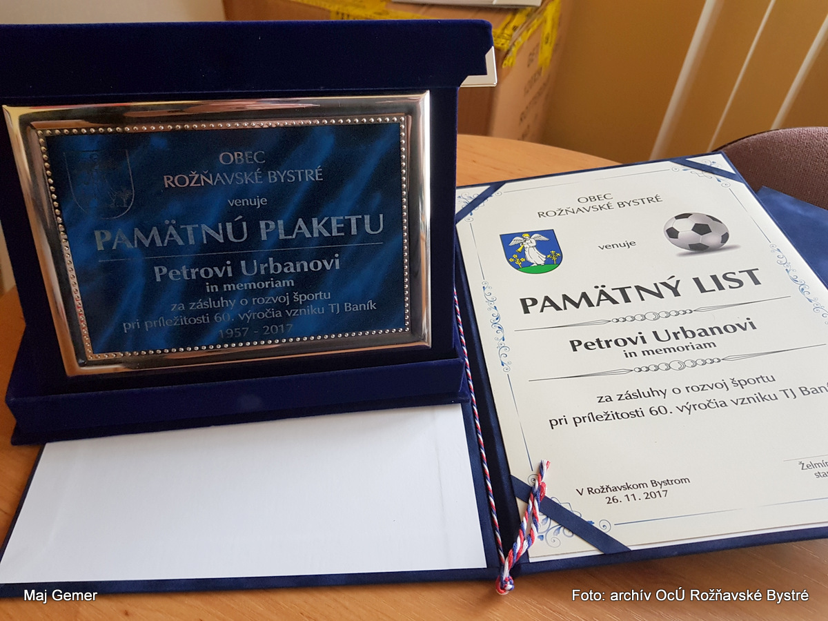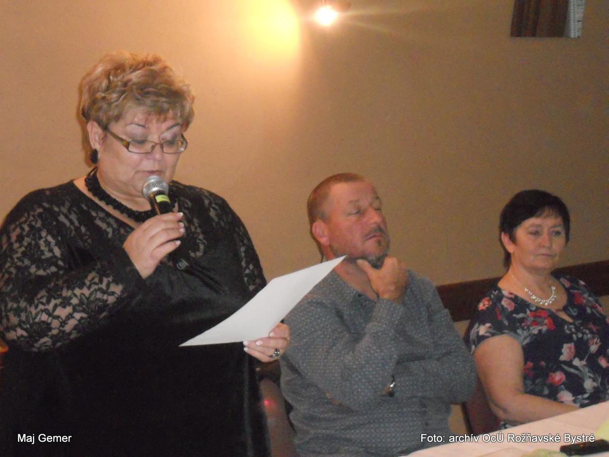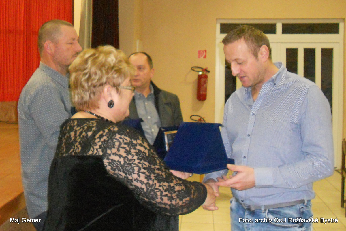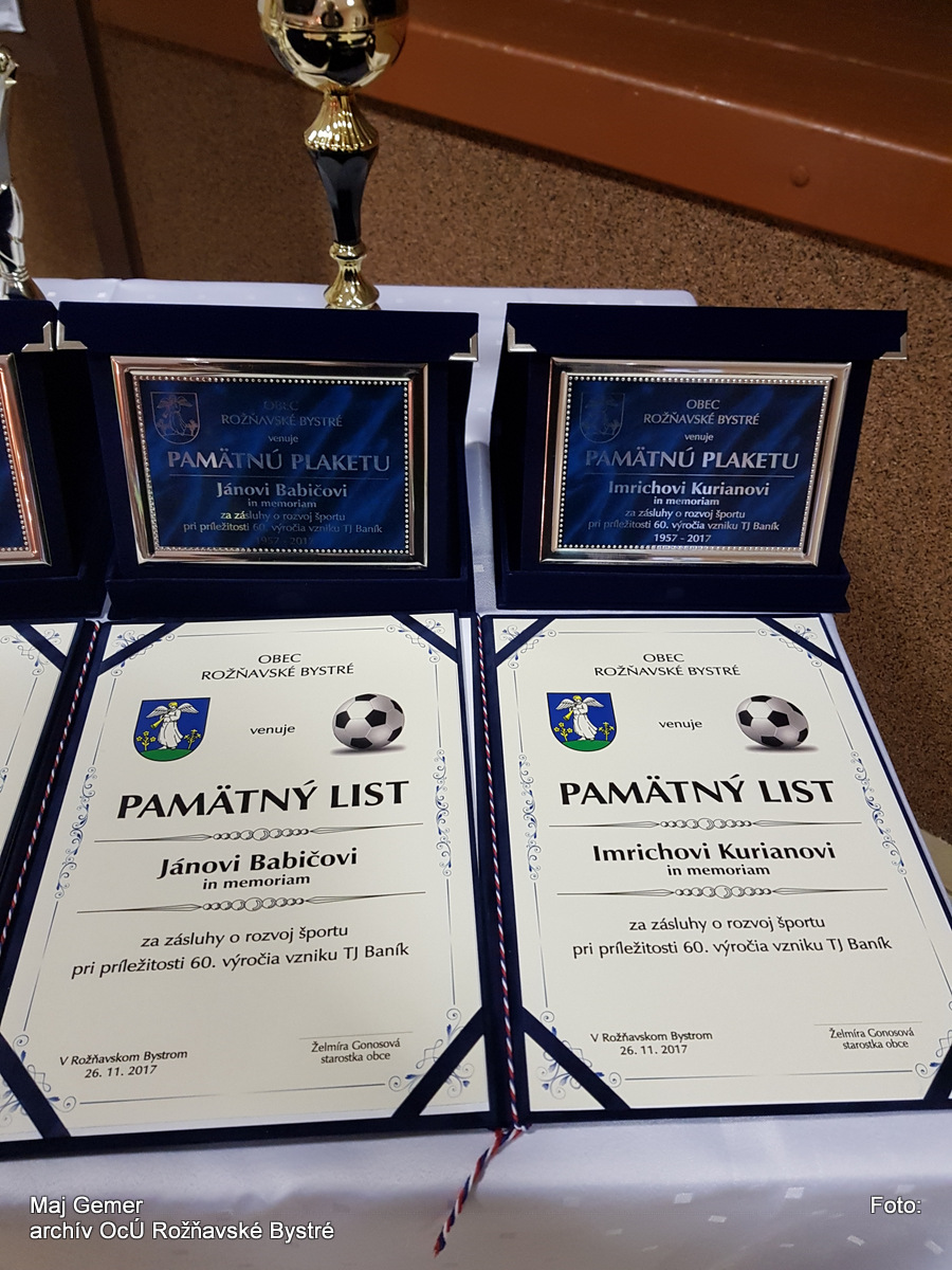 Potom nasledoval príhovor starostky obce pani Želmíry Gonosovej, ktorý sa začal minútou ticha za tých, ktorí už nie sú medzi nami. V úvode svojho vystúpenia poďakovala prítomným za účasť a „prebehla“ dejinami našej TJ od jej založenia až po dnešok. Významnými medzníkmi bezosporu sú vybudovanie terajšieho ihriska v Moste, výstavba tribúny a šatní, zakúpenie vlastného autobusu, na tú dobu všetko neobvyklé javy, nakoľko išlo o povojnové roky, kde štát riešil dôležitejšie problémy. Ako je známe, naša Tj každoročne medzi sezónami v lete usporadúva memoriál Jána Babiča, Petra Urbana, Miroslava Lindáka, ktorí boli vynikajúci futbalisti a zahynuli pri výkone svojho povolania. Pri tejto príležitosti boli ich rodinným príslušníkom odovzdané pamätné plakety a tak isto aj Imrichovi Kurianovi in memoriam, ktorý bol dlhé roky učiteľom a riaditeľom Základnej školy v Rožňavskom Bystrom a vychoval nespočetné množstvo futbalistov. Sám bol dlhé roky aktívnym futbalistom a neskôr trénerom. Už v tej dobe začal vydávať spravodaj o futbale, ktorý možno označiť za predchodcu nášho terajšieho spravodaja.